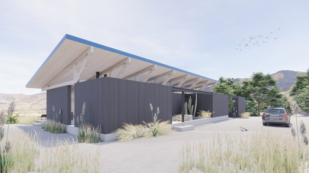 Para lograr lo anterior, es que se propueso una vivienda de un piso, paralela a las cotas del terreno, lo cual era suficiente para cumplir con los metros cuadrados necesarios. En el sentido transversal de la casa, se propuso una cubierta inclinada de Sur a Norte, la cual se “levanta” desde el Sur, obtenido una buena luz cenital pero no sol directo, y se extiende y baja hacia el Norte con un buen alero para evitar que el sol entre directamente al interior de la casa en los meses más calurosos. Este techo se sostiene por 8 cerchas o “costillas” que están dispuestas a una distancia equivalente a lo largo de la casa. La geometría de cada una de estas cerchas hace referencia a un tipo de escuadra llamada “Cartabón”.