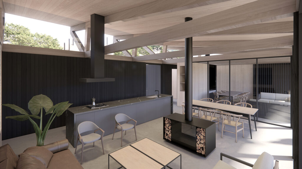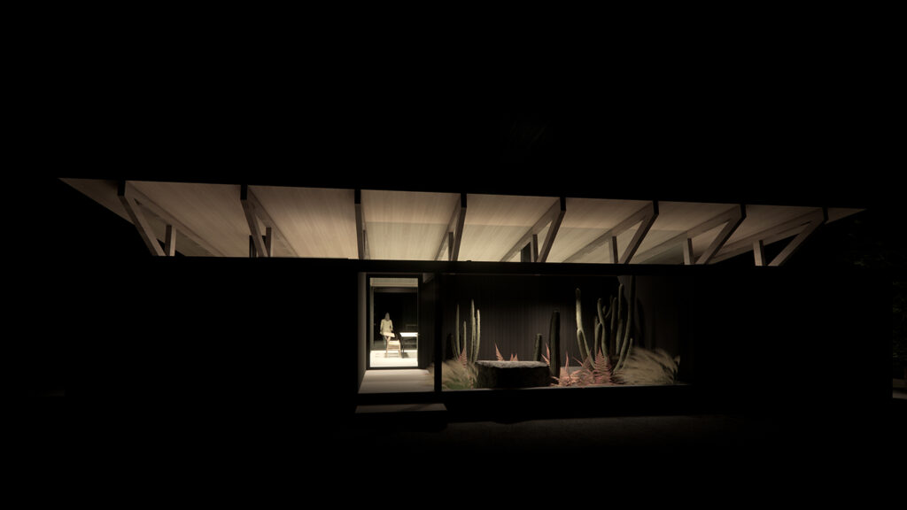Finalmente, se estudió el tratamiento lumínico con el objetivo de que durante la noche, por un lado la casa se vea habitada y por otro, que se pongan en valor las estructuras de madera laminada que soportan la techumbre con una apariencia estructural ligera.